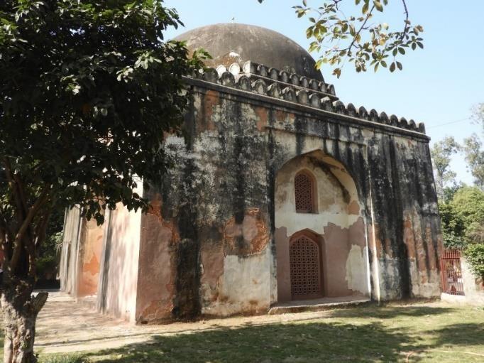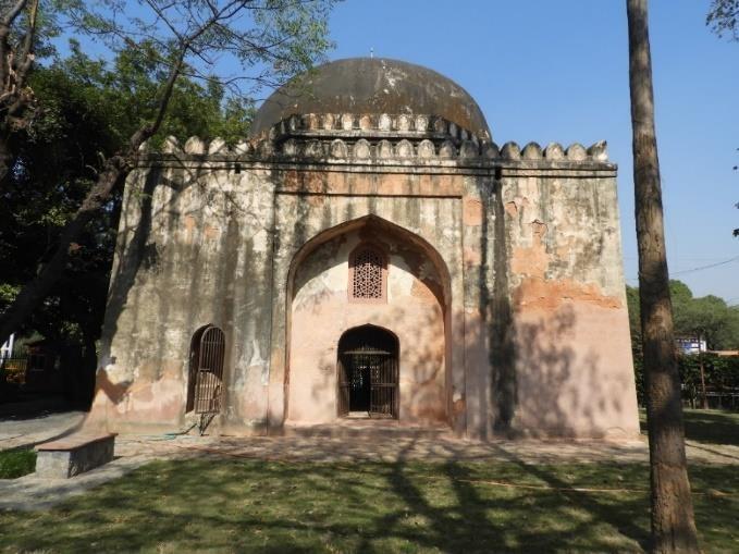 6. | Architectural style | It has a square base plan with recessed Pointed arch and central doorway, Jali over the doorways. A staircase on the southern side leads to the terrace. The circular medallion at the centre of soffit of the domed ceiling is highly ornamental and an exemplary art work. Another feature of this simple yet stout structure is battlements at the parapet level Externally, one of the characteristics of the Tughlaq and Lodi period monuments. The tomb is constructed of random rubble masonry with fine layer of plaster. |