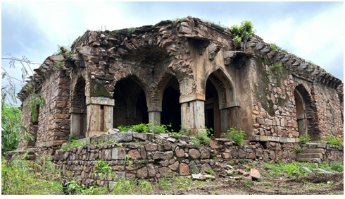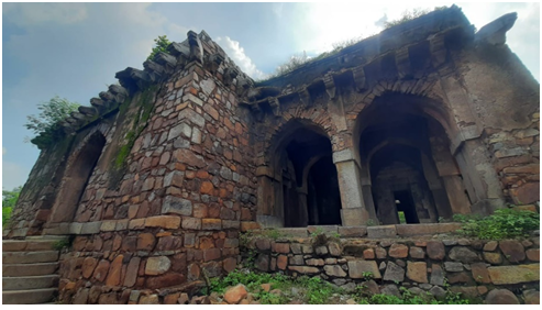 MalchaMahal is a Tughlaq era structure built in Sandstone, built of elevated top which served as a hunting lodge. The main entrance resides on the east 660sqm. The current plinth height of the structure is 1.5m which is accessed by two sided staircase. The main entrance consists of continuous arches forming an alley which further leads to central hall. The whole spaces are formed through arches reflecting the grandeur of the Tughlaqs and allowing ventilation throughout the structure. The Palace has Nine rooms in which the central rooms is larger and open in four sides. The four corner rooms are open with arches on two sides. There are total six staircase in the structure in which two front staircase are circular and others are L-shaped in the centre of rooms.The arched halls forms cloister vault individually supported with four columns and squinches. The inner chamber openings on four sides has flat lintel instead of pointed arches in all other arches with square or rectangular columns. The Structure façade consist of repetitive brackets above the arches and Kangura pattern with medallions on the parapet level above these brackets. The parapet’s hardly 0.6m in height with rain water spouts (currently existing only in the north side).